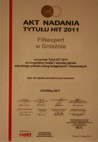 W Auli Uniwersytetu im. Adama Mickiewicza w Poznaniu w dniu 12 lutego rozstrzygnięto konkurs promocyjny HIT Wielkopolski 2011. Z zadowoleniem przyjęliśmy fakt, że FINexpert otrzymał zaszczytny tytuł - HIT 2011 - za oryginalny model i wysoką jakość szerokiego pakietu usług księgowych i finansowych.